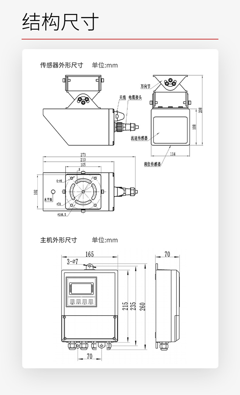 本产品是在自然水域中测量水的流速、水位的仪表。测距雷达单元工作频率为 80GHz,测速雷达单元工作频率为 24GHz。测量点在机体前方,不破坏流场,适用于泥沙悬浮物含量高、水草等漂浮物多和极其严苛的冰期场合的河流中测量。可广泛适用于水位测站、灌溉支渠、污雨水管网等流量监测。