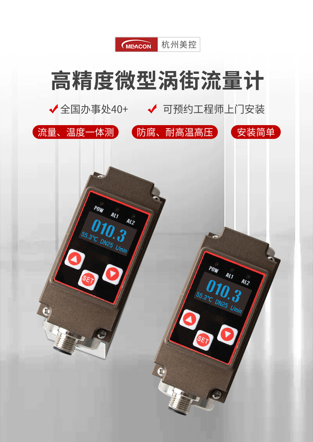 微型涡街流量计结构简单、精确度高、安装维修使用方便,可对管道中的液体流量及温度情况进行实时监控,支持流量和温度(4~20)mA 信号或 485 通信、报警开关输出,并采用 OLED 实时显示流体流量及温度,实现管道当中流量温度一体式的监控功能。本产品广泛应用于石油化工、电力、治金、钢厂、造纸、食口品加工、水处理、电池厂等行业。