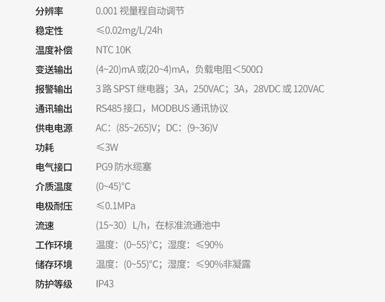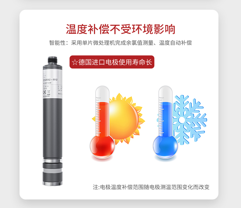 本余氯仪标配德国原装进口 RG 余氯电极,对水溶液中的的余氯浓度进行连续监测和控制。仪表具有电流输出、测量范围自由设定、高低超限报警提示和三组继电器控制开关、迟滞量范围可调、自动温度补等功能。广泛用于自来水、工业污水、废水处理、海水处理、游泳池、管网末端余氯监测。