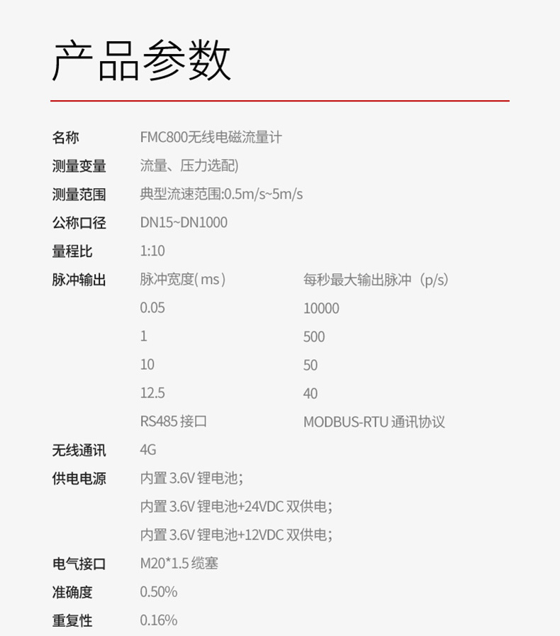 UED官网,_FMC800无线电磁流量计由电磁流量计和 4G 无线远传模块共同组成,用于测量封闭管道内导电液体的瞬时流量和累积流量。测量数据通过 4G 信号远传至网络接收平台,用户可以通过浏览器、微信公众号等方式灵活方便地查看数据、远程配置参数等功能,实现智能物联。广泛应用于自来水、化工、煤炭、环保、轻纺、冶金、造纸等行业。 流量转换器为电池供电型转换器,标配一个常规锂电池组,可持续工作 3~6 年。若配用高容量锂电池组,工作时间会更长。