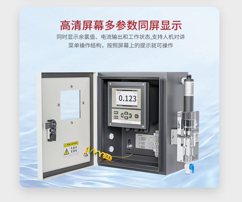本余氯仪标配德国原装进口 RG 余氯电极,对水溶液中的的余氯浓度进行连续监测和控制。仪表具有电流输出、测量范围自由设定、高低超限报警提示和三组继电器控制开关、迟滞量范围可调、自动温度补等功能。广泛用于自来水、工业污水、废水处理、海水处理、游泳池、管网末端余氯监测。